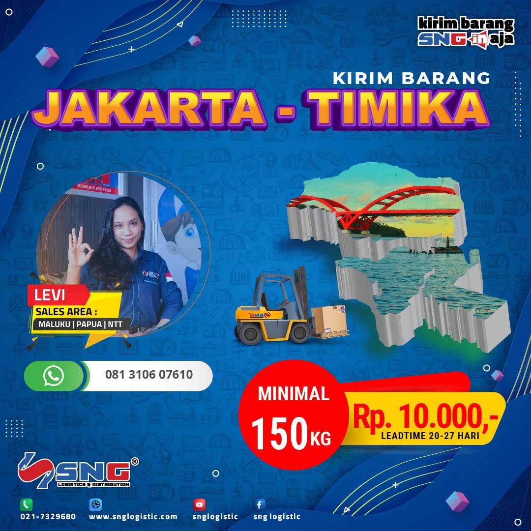 Ekspedisi Jakarta Timika - Dengan Ongkir Jakarta Timika yang murah, barang Anda akan diantar langsung ke tujuan oleh tim Profesional SNG Logistic. Kami selalu memprioritaskan lead time dan keamanan barang customer dalam melakukan setiap misi ekspedisi. Ongkir Jakarta Timika hanya Rp 10.000/kilogram dengan minimal kirim barang ke Timika via laut 150 kilogram estimasi 20 hari sampai. Jasa pengiriman SNG Logistic bukan sekadar memberikan layanan ekspedisi murah ke Timika. SNG Logistic mampu memberikan pelayanan terbaik dan berkualitas karena dilengkapi oleh support fasilitas terbaik. Untuk memperlancar proses kirim barang ke Timika, kami memahami dengan baik rute tujuan. Kami juga memiliki gudang penyimpanan barang SNG Logistic juga sangat luas sehingga Anda tak perlu takut barang rusak atau tertukar dengan customer lain. Untuk pengiriman barang berat kami juga punya layanan forklift yang memudahkan proses bongkar muat barang. Ongkir Jakarta Timika juga disesuaikan dengan berat faktual barang karena kami punya timbangan digital 3 ton yang sudah dikalibrasi dan bersertifikat resmi Mendagri. Jadi, hasil penimbangan lebih akurat. Untuk Anda yang tak sempat packing barang dengan aman, SNG logistic juga menyediakan layanan gratis packing kardus dan plastik.