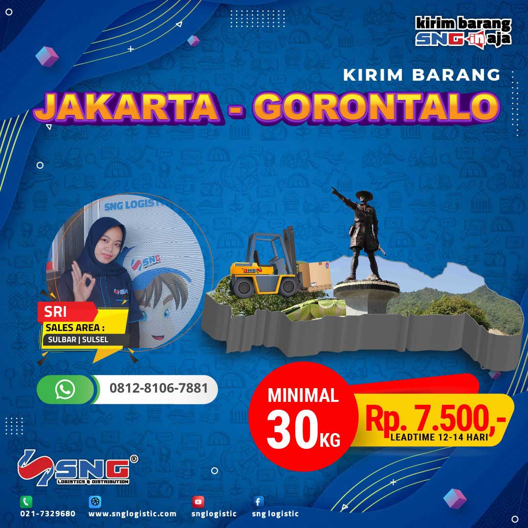 Ekspedisi murah ke Gorontalo dengan Ongkir Jakarta Gorontalo Rp6.000/kilogram. Tarif pengiriman tersebut berlaku untuk pengiriman cargo Jakarta Gorontalo minimal 50 kilogram dengan estimasi 14 hari sampai. Jasa pengiriman ke Gorontalo SNG Logistic punya fasilitas terbaik yang mendukung kelancaran proses pengiriman cargo ke Gorontalo. Anda juga bisa memesan layanan ekspedisi ke Sulawesi Utara dengan tujuan Limboto, Marisa, Kwandang, Suwawa, dan Limboto dengan rincian tarif sebagai berikut: