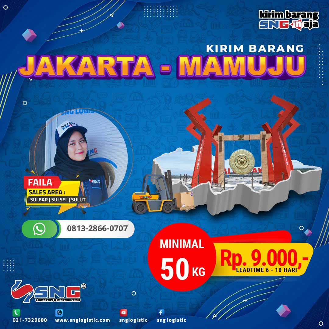 Ekspedisi Jakarta Mamuju – SNG Logistic kini menyediakan jasa pengiriman ke Mamuju dari Jakarta dengan ongkir Jakarta Mamuju Rp 9000/kilogram dan minimal pengiriman cargo Mamuju 50 kilogram. Estimasi kirim cargo murah ke Mamuju hanya sekitar 6 - 10 hari saja. Dengan layanan cepat dan ongkir Jakarta Mamuju yang murah, barang Anda dijamin tiba di tujuan tepat waktu tanpa ada kerusakan sekecil apapun. Jasa ekspedisi ke Mamuju SNG Logistic dilengkapi oleh support fasilitas terbaik untuk menunjang jalannya proses ekspedisi Jakarta Mamuju. Kami juga memiliki gudang dan agen khusus wilayah Jakarta, Surabaya dan Makassar yang akan mempermudah Anda menjangkau jasa pengiriman ke Mamuju SNG Logistic. SNG Logistic juga menyediakan layanan ekspedisi ke Sulawesi Barat dengan tujuan Polewali, Majene, Mamasa, dan Pasangkayu